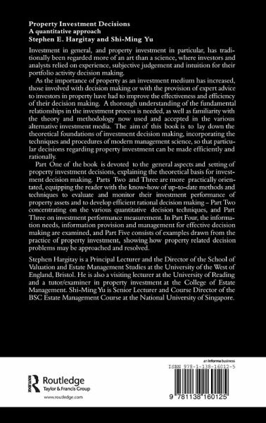 The first part of the book explains the theoretical basis for investment decision-making. Parts two and three are more practically orientated, and will equip the reader with the know-how of up-to-date methods and techniques to evaluate and monitor the investment performance of property assets and to develop efficient rational decision-making.