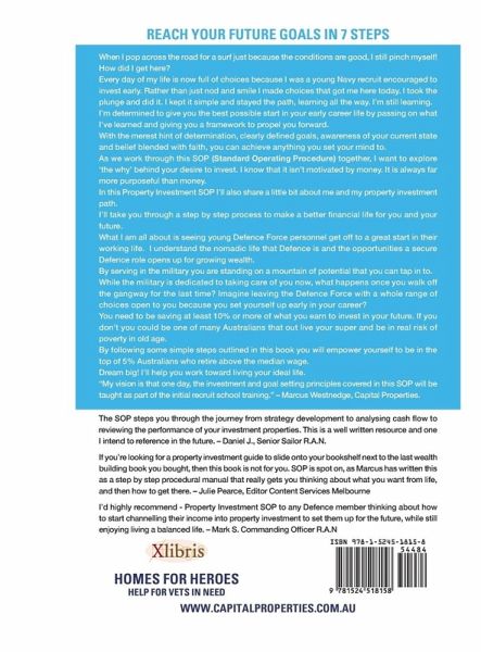 This is a break through book for the Defence Force property investor (Joe Passione; leading builder, developer, and director of Prime Projects Construction). When I pop across the road for a surf just because the conditions are good, I still pinch myself! How did I get here? Every day of my life is now full of choices because I was a young navy recruit encouraged to invest early. Rather than just nod and smile, I made choices that got me here today. I took the plunge and did it. I kept it simple and stayed on the path, learning all the way. Im still learning. Im determined to give you the best possible start in your early career life by passing on what Ive learned and giving you a framework to propel you forward. With the merest hint of determination, clearly defined goals, awareness of your current state, and belief blended with faith, you can achieve anything you set your mind to. As we work through this SOP together, I want to explore the why behind your desire to invest. I know that it isnt motivated by money. It is always far more purposeful than money. In this Property Investment SOP, Ill share a little bit about me and my property investment path. Ill take you through a step-by-step process to make a better financial life for you and your future. What I am all about is seeing young Defence Force personnel get off to a great start in their working life. I understand the nomadic life that Defence is and the opportunities a secure Defence role opens up for growing wealth. By serving in the military, you are standing on a mountain of potential that you can tap into. While the military is dedicated to taking care of you now, what happens once you walk off the gangway for the last time? Imagine leaving the Defence Force with a whole range of choices open to you because you set yourself up early in your career. You need to be saving at least 10 percent or more of what you earn to invest in your future. If you dont, you could be one of many Australians that outlive your super and be in real risk of poverty in old age. By following some simple steps outlined in this book, you will empower yourself to be in the top 5% Australians who retire above the median wage. Dream big! Ill help you work toward living your ideal life. My vision is that, one day, the investment and goal-setting principles covered in this SOP will be taught as part of Defence Force training and embedded before that, in the Australian school curriculum (Marcus Westnedge, Capital Properties).