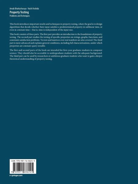 This book introduces important results and techniques in property testing, where the goal is to design algorithms that decide whether their input satisfies a predetermined property in sublinear time, or even in constant time - that is, time is independent of the input size.