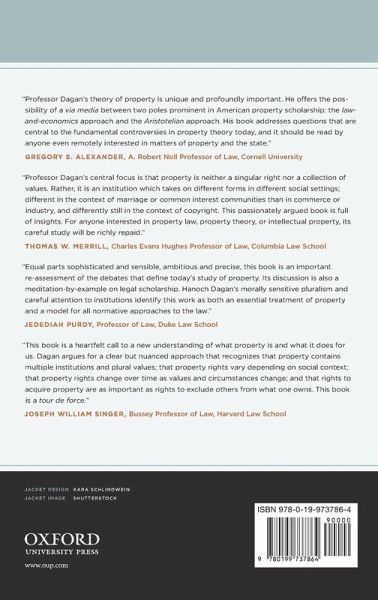 Property: Values and Institutions, by Hanoch Dagan, offers an original understanding of property, different from the dominant voices in the field, yet loyal to the practice of property. It rejects the misleading dominant binarism in which property is either one monistic form, structured around Blackstone's (in)famous formula of sole and despotic dominion, or a formless bundle of rights. Instead, it conceptualizes property as an umbrella for a set of institutions bearing a mutual family resemblance. It resists the prevailing tendency to discuss property through the prism of only one particular value, notably efficiency. Dagan argues that property can, and should, serve a pluralistic set of liberal values. These property values include not only autonomy and utility, which are emphasized by many contemporary scholars, but also labor, personhood, community, and distributive justice. Dagan claims that property law, at least at its best, tailors different configurations of entitlements to different property institutions, with each such institution designed to match the specific balance between property values best suited to its characteristic social setting. Dagan develops this theoretical account and applies it to key doctrinal contexts. In particular, he analyzes the normative underpinnings of the doctrines regulating the interactions between landowners and governments (both eminent domain and regulatory takings doctrines) and those regulating the governance of property owned by multiple owners (such as co-ownership, marital property, and the law of common interest communities).
