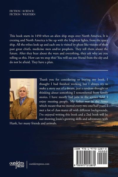 This book starts in 1450 when an alien ship stops over North America. It is evening and North America is lite up with the brightest lights, from the space ship. All the tribes look up and each one is visited by ghost like visions of their past great chiefs, medicine men and/or prophets. They tell them about the future. After they hear about the wars and everything, they ask why are you telling us this. How can we stop this? You will see our friend from the sky and do not be afraid. They have a plan. Thank you for considering or buying my book. I thought I had finished working but I always try to make a story out of a dream, just a random thought or thinking about something I remembered from family stories. I have mostly had jobs in the service field. I enjoy meeting people. My father was in the Army which meant that we moved every two one/half years. I met a lot of class mates all with different backgrounds. I've enjoyed writing this book and a 2nd book will be out showing Jessie's growing skills and adventures with Hank, her many friends and animals.
