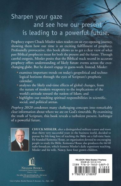 Dr. Chuck Missler's Prophecy 20/20 is a comprehensive, easily digested book that will give you a basic understanding of how past events fulfilled biblical prophecy. It provides a strategic grasp of prophecy that equips you to clearly see the "prophetic moment" of current events. Chuck Missler, founder of Koinonia House, analyzes trends on the geopolitical and technological horizons as well as their implications for the coming years.