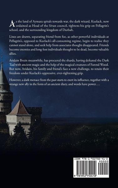 As the land of Aymara spirals towards war, the dark wizard, Kuelack, now ordained as Head of the Sivan council, tightens his grip on Pellagrin's school, and the surrounding kingdom of Durbah. Lines are drawn, separating friend from foe, as other powerful individuals at Pellagrin's, opposed to Kuelack's all-consuming regime, begin to realise they cannot stand alone, and seek help from associates thought disappeared. Friends become enemies and long-lost individuals thought to be dead, become valuable allies. Aridain Bruin meanwhile, has procured the shards, having defeated the Dark Taal with ancient magic and the help of the magical creatures of Farend Wood. But now, Aridain, his family and friend's face a new challenge, to retain their freedom under Kuelack's oppressive, ever-tightening grip. However, a dark menace from the past starts to exert its influence, together with a strange new ally in the form of an ancient diary, and words have power....