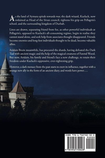 As the land of Aymara spirals towards war, the dark wizard, Kuelack, now ordained as Head of the Sivan council, tightens his grip on Pellagrin's school, and the surrounding kingdom of Durbah. Lines are drawn, separating friend from foe, as other powerful individuals at Pellagrin's, opposed to Kuelack's all-consuming regime, begin to realise they cannot stand alone, and seek help from associates thought disappeared. Friends become enemies and long-lost individuals thought to be dead, become valuable allies. Aridain Bruin meanwhile, has procured the shards, having defeated the Dark Taal with ancient magic and the help of the magical creatures of Farend Wood. But now, Aridain, his family and friend's face a new challenge, to retain their freedom under Kuelack's oppressive, ever-tightening grip. However, a dark menace from the past starts to exert its influence, together with a strange new ally in the form of an ancient diary, and words have power....