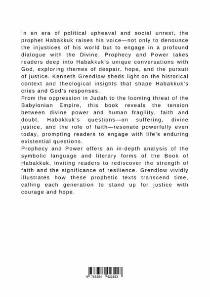 In an era of political upheaval and social unrest, the prophet Habakkuk raises his voice-not only to denounce the injustices of his world but to engage in a profound dialogue with the Divine. Prophecy and Power takes readers deep into Habakkuk's unique conversations with God, exploring themes of despair, hope, and the pursuit of justice. Kenneth Grendlow sheds light on the historical context and theological insights that shape Habakkuk's cries and God's responses.From the oppression in Judah to the looming threat of the Babylonian Empire, this book reveals the tension between divine power and human fragility, faith and doubt. Habakkuk's questions-on suffering, divine justice, and the role of faith-resonate powerfully even today, prompting readers to engage with life's enduring existential questions.Prophecy and Power offers an in-depth analysis of the symbolic language and literary forms of the Book of Habakkuk, inviting readers to rediscover the strength of faith and the significance of resilience. Grendlow vividly illustrates how these prophetic texts transcend time, calling each generation to stand up for justice with courage and hope.