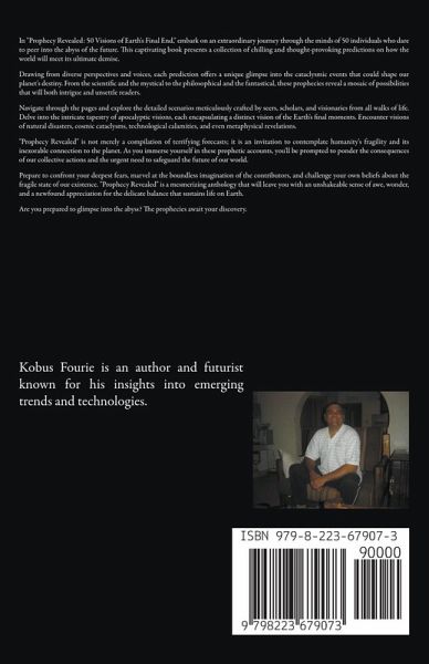 In "Prophecy Revealed: 50 Visions of Earth's Final End," embark on an extraordinary journey through the minds of 50 individuals who dare to peer into the abyss of the future. This captivating book presents a collection of chilling and thought-provoking predictions on how the world will meet its ultimate demise. Drawing from diverse perspectives and voices, each prediction offers a unique glimpse into the cataclysmic events that could shape our planet's destiny. From the scientific and the mystical to the philosophical and the fantastical, these prophecies reveal a mosaic of possibilities that will both intrigue and unsettle readers. Navigate through the pages and explore the detailed scenarios meticulously crafted by seers, scholars, and visionaries from all walks of life. Delve into the intricate tapestry of apocalyptic visions, each encapsulating a distinct vision of the Earth's final moments. Encounter visions of natural disasters, cosmic cataclysms, technological calamities, and even metaphysical revelations. "Prophecy Revealed" is not merely a compilation of terrifying forecasts; it is an invitation to contemplate humanity's fragility and its inexorable connection to the planet. As you immerse yourself in these prophetic accounts, you'll be prompted to ponder the consequences of our collective actions and the urgent need to safeguard the future of our world. Prepare to confront your deepest fears, marvel at the boundless imagination of the contributors, and challenge your own beliefs about the fragile state of our existence. "Prophecy Revealed" is a mesmerizing anthology that will leave you with an unshakeable sense of awe, wonder, and a newfound appreciation for the delicate balance that sustains life on Earth. Are you prepared to glimpse into the abyss? The prophecies await your discovery.