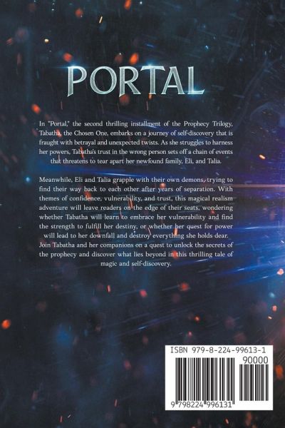 In "Portal," the second thrilling installment of the Prophecy Trilogy, Tabatha, the Chosen One, embarks on a journey of self-discovery that is fraught with betrayal, and unexpected twists. As she struggles to harness her powers, Tabatha's trust in the wrong person setting off a chain of events that threatens to tear apart her newfound family, Eli, and Talia. Meanwhile, Eli and Talia grapple with their own demons, trying to find their way back to each other after years of separation. With themes of confidence, vulnerability, and trust, this magical realism adventure will leave readers on the edge of their seats, wondering whether Tabatha will learn to embrace her vulnerability and find the strength to fulfill her destiny, or whether her quest for power will lead to her downfall and destroy everything she holds dear. Join Tabatha and her companions on a quest to unlock the secrets of the prophecy and discover what lies beyond in this thrilling tale of magic and self-discovery.