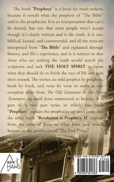 The book "Prophecy" is a book for truth seekers, because it reveals what the prophets of "The Bible" said in the prophecies. It is an interpretation that can't be denied, but one that most people won't accept though it's clearly written and is the truth. It is raw, biblical, factual, and controversial, and all the texts are interpreted from "The Bible" and explained through history, and life's experience, and it is written so that those who are seeking the truth would search the scriptures and seek THE HOLY SPIRIT to know what they should do to finish the race of life and gain their reward. The stories are told prophet by prophets, book by book, and verse by verse in order as one complete story from The Old Testament to The New Testament, up until Jesus resurrected to heaven. It is part of a two part series in which this book "Prophecy" explain the prophecies up until Jesus, and the other book "Revelation is Prophecy II" explain from the time of Jesus to what Jesus said would happen in the prophecies of "The End Times"