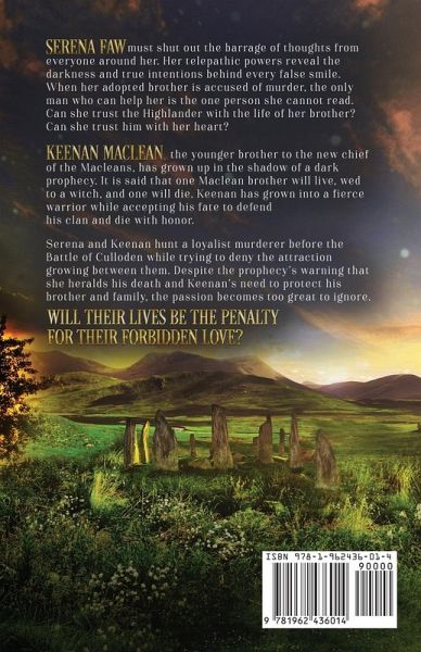 Forbidden love * Steamy * Magic * Witches * Sexy Highlanders Serena Faw must shut out the barrage of thoughts from everyone around her. Her telepathic powers reveal the darkness and true intentions behind every false smile. When her adopted brother is accused of murder, the only man who can help her is the one person she cannot read. Can she trust the Highlander with the life of her brother? Can she trust him with her heart? Keenan Maclean, the younger brother to the new chief of the Macleans, has grown up in the shadow of a dark prophecy. It is said that one Maclean brother will live, wed to a witch, and one will die. Keenan has grown into a fierce warrior while accepting his fate to defend his clan and die with honor. Serena and Keenan hunt a loyalist murderer before the Battle of Culloden while trying to deny the attraction growing between them. Despite the prophecy's warning that she heralds his death and Keenan's need to protect his brother and family, the passion becomes too great to ignore. Will their lives be the penalty for their forbidden love?