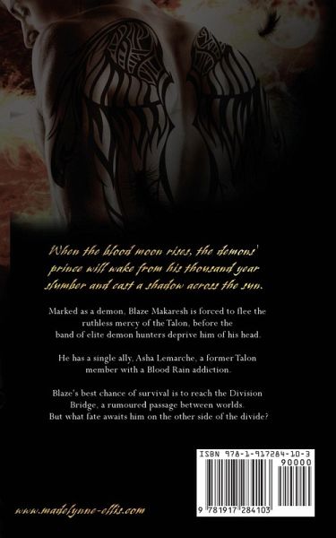 He's a demon prince... She's trained to kill his kind... Their love might prove the death of them both. Marked as a demon, Blaze Makaresh is forced to flee for his life from the ruthless mercy of the Talon, before the band of elite demon hunters deprive him of his head. Only one person offers him any hope, Asha Lemarche, a former Talon assassin with a Blood Rain addiction, but can he really rely on his enemy? Blaze's best chance of survival is to reach the Division Bridge, rumoured to be a passageway between worlds. But what fate awaits him on the other side? Is he ready to abandon his humanity and embrace his heritage?