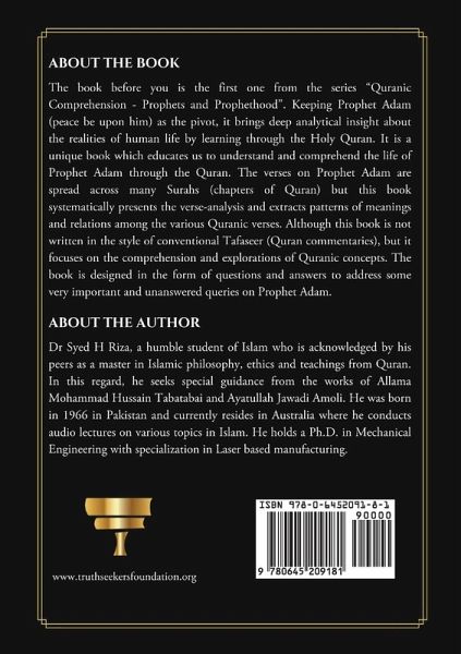 The book before you is the first one from the series "Quranic Comprehension - Prophets and Prophethood". Keeping Prophet Adam (peace be upon him) as the pivot, it brings deep analytical insight about the realities of human life by learning through the Holy Quran. It is a unique book which educates us to understand and comprehend the life of Prophet Adam through the Quran. The verses on Prophet Adam are spread across many Surahs (chapters of Quran) but this book systematically presents the verse-analysis and extracts patterns of meanings and relations among the various Quranic verses. Although this book is not written in the style of conventional Tafaseer (Quran commentaries), but it focuses on the comprehension and explorations of Quranic concepts. The book is designed in the form of questions and answers to address some very important and unanswered queries on Prophet Adam.