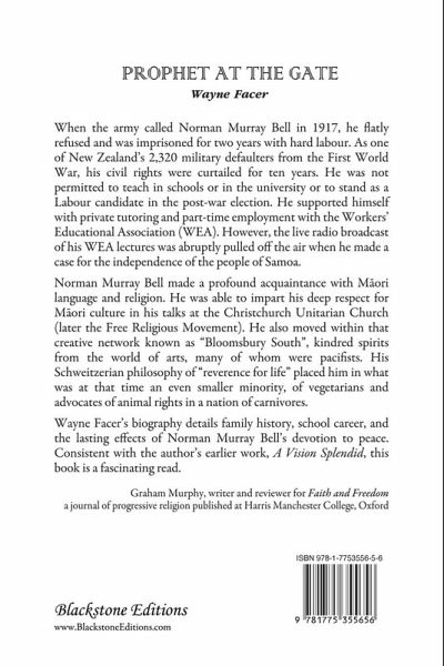Norman Murray Bell (1887-1962) may be regarded as a prophet: a person who speaks in a visionary way about a cause. His cause was peace. His life provides a window into the peace movement in New Zealand, particularly during the period between the two world wars. Bell was educated at New Zealand's oldest and most prestigious Church of England school, Christ's College in Christchurch. There he was confirmed into the Anglican Church and, in keeping with the school's military ethos with the ideals of honour and duty, trained in the army cadets. He graduated from the University of New Zealand with a BA and MA in classics and chemistry in 1909. His academic career in New Zealand culminated in an award that would take him to Trinity College, Cambridge University.At Trinity College from 1909 to 1912, he completed his BA with first-class honours and won the College Classics prize. He was a visiting researcher in the Chemistry Department at the University of Liverpool between 1913 and 1914. He spent one academic year at St Andrews University as a research student in Education, then spent a year studying Philosophy of Science at Bern University in Switzerland, 1915-1916. During this time, Bell was also studying theology at London University. It is most likely at this time that he developed his ideas about pacifism, which he saw as intricately linked to his Christian belief. Upon his return to New Zealand in 1917, Bell, now twenty-nine years old, obtained a teaching position at Christchurch Boys High School. His tenure as a teacher would be short-lived, however. As a pacifist, he ran up against the requirements of the Military Service Act 1916, which required the registration of all non-M¿ori men between the ages of 20 to 46 years. Publicly known to be a religious objector, Bell was arrested for breach of the Act. Eventually he was convicted at a district court-martial of disobeying lawful commands given by a superior officer and sentenced to two years' imprisonment with hard labour. Following his release from prison, his political ambitions were thwarted by legal restrictions which deprived conscientious objectors of their civil rights. Prohibited from any government-related work, such as a university college teacher, he supported himself as a private instructor for secondary students and a part-time Tutor in sociology for the Workers' Educational Association. Throughout the 1920s and 30s Bell campaigned on the political front: by 1934 he was national president of the No More War campaign, which functioned in tandem with the Free Religious Movement. In 1930 he experienced a unique psychological event which transformed his life. In a period of altered consciousness, he saw the web of life that connected all living things. After this revelation, while continuing his work with the National Peace Council, No More War Movement and the Movement Against War and Fascism, he embraced the creed of vegetarianism and expounded it with unsurpassed zeal. During World War II Bell struggled to publish his pacifist journal Cosmos, printing it by hand and delivering copies on foot. His home was often raided by the police, at the instigation of the security authorities searching for evidence of any seditious activities. After the war he could be found with a chair and small table sitting in Cathedral Square, the heart of Christchurch, with his petition calling for people to sign up opposing all war, especially nuclear war, and seeking support for animal welfare. But his journey did not quite end with his death in 1962. Having provided in his will that his estate be spent on 30 years of newspaper advertisements calling for peace between humans and domesticated animals, he ensured that he would speak beyond his age and time.
