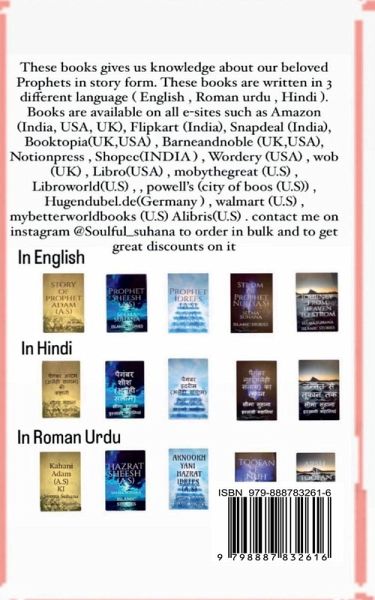 Books are available on all e-sites such as Amazon (India, USA, UK), Flipkart (India), Snapdeal (India), Booktopia(UK,USA) , Barneandnoble (UK,USA), Notionpress , Shopee(INDIA ) , Wordery (USA) , wob (UK) , Libro(USA) , mobythegreat (U.S) , Libroworld(U.S) , , powell’s (city of boos (U.S)) , Hugendubel.de(Germany ) , walmart (U.S) , mybetterworldbooks (U.S) Alibris(U.S) , Booksus.com(korea) , Saxo (Danish Krone ( Denmark, Greenland ,Faroe Island) ,Angus&Robertson.com.au(UK,USA) , imusic.co(USA), shopsy (INDIA) , Bookshop.org (US) , Abebooks(USA) , dymocks.com.au(UK,USA) , Kriso.ee(Europe) , Booksamillion.com(UK,USA) , Libreriauniversitaria(Europe) . contact me on instagram @Soulful_suhana to order in bulk and to get great discounts on it (A.S)-Alaihi Salam These books are available in English , Hindi , Roman Urdu English : Book 1 : Story of Prophet Adam (A.S) Book 2: Prophet Sheesh (A.S) Book 3: Prophet Idrees (A.S) Book 4 :Strom of Prophet Nuh (A.S) Book 5 : Journey from heaven to strom ( Story of Prophet Adam (A.S) from heaven to Prophet Nuh (A.S) in floods and strom) Roman Urdu Book 1 : "" Kahani Adam (A.S ) Ki"" Book 2:""Hazrat Sheesh (A.S) "" Book 3: "" Aknookh Yani Hazrat Idrees (A.S) "" Book 4 :""Toofan -e-Nuh "" (Story of Hazrat Nuh (A.S)"" Book 5 :""Arsh se Toofan Tak "" (Story of Hazrat Adam (A.S) in Jannah to Hazrat Nuh (A.S) In Floods And Strom )