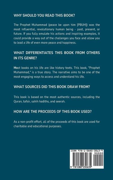 Why should you read this book? The Prophet Muhammad (peace be upon him [PBUH]) was the most influential, revolutionary human being - past, present, or future. If you fully emulate his actions and inspiring examples, it could provide a way out of the challenges you face and allow you to lead a life of even more peace and happiness. What differentiates this book from others in its genre? Most books on his life are like history texts. This book, "Prophet Muhammad," is a true story. The narrative aims to be one of the most engaging ways to access, appreciate, and understand his life. It is not intended to cover all details but rather focuses on many of the compelling episodes of his story. Are there any reputable scholars who influenced this writing? In the first version of this book, Sheikh Omar Suleiman's review helped to strengthen the writing. The lectures of Sheikh Yasir Qadhi positively influenced the second iteration of this book and have referenced him as a source throughout. He in turn used the most authentic sources (see below). In this third and current iteration of the book, Sheikh Mohamed Yousef Jendy provided extensive edits to ensure this true, non-fiction story of the Last Messenger (PBUH) resonates for this generation and for future generations. Sheikh Mohamed Yousef Jendy is an Azhari scholar and an Imam in Egypt. What sources did this book draw from? This book is based on the most authentic sources, including the Quran, tafsir, sahih hadiths, and seerah. Who is the author? Al Arqam is the author's pen name. He is a graduate of University of California, Berkeley. At the time of this writing, Al Arqam is a professional working for a mega cap tech company. He has lived in the United States as well as in the Middle East. How are the proceeds of this book used? As a non-profit effort, all of the proceeds of this book are used for charitable and educational purposes.