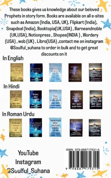 These books gives us knowledge about our beloved Prophets in story form . Books are available on all e-sites such as Amazon (India , USA , UK ) , Flipkart (India ) , Snapdeal (India) , Booktopia (UK,USA) , Barneandnoble(UK,USA) Shopee (India) ,wordery (USA) ,Wob (UK), Libro (USA) , Notionpress . contact me on instagram @Soulful_suhana to order in bulk and to get great discounts on it (A.S)-Alaihi Salam These books are available in English , Hindi , Roman Urdu English : Book 1 : Story of Prophet Adam (A.S) Book 2: Prophet Sheesh (A.S) Book 3: Prophet Idrees (A.S) Book 4 :Strom of Prophet Nuh (A.S) Book 5 : Journey from heaven to strom ( Story of Prophet Adam (A.S) from heaven to Prophet Nuh (A.S) in floods and strom) Roman Urdu Book 1 : "" Kahani Adam (A.S ) Ki"" Book 2:""Hazrat Sheesh (A.S) "" Book 3: "" Aknookh Yani Hazrat Idrees (A.S) "" Book 4 :""Toofan -e-Nuh "" (Story of Hazrat Nuh (A.S)"" Book 5 :""Arsh se Toofan Tak "" (Story of Hazrat Adam (A.S) in Jannah to Hazrat Nuh (A.S) In Floods And Strom ) Hindi ¿¿¿¿¿¿ 1: ¿¿¿¿¿¿ ¿¿¿ (¿¿¿¿¿ ¿¿¿¿) ¿¿ ¿¿¿¿¿ ¿¿¿¿¿¿ 2: ¿¿¿¿¿¿ ¿¿¿ (¿¿¿¿¿ ¿¿¿¿) ¿¿¿¿¿¿ 3: ¿¿¿¿¿¿ ¿¿¿¿¿ (¿¿¿¿¿ ¿¿¿¿) ¿¿¿¿¿¿ 4: ¿¿¿¿¿¿ ¿¿¿ (¿¿¿¿¿ ¿¿¿¿) ¿¿ ¿¿¿¿¿ ¿¿¿¿¿¿ 5: ¿¿¿¿¿ ¿¿ ¿¿¿¿¿ ¿¿ (¿¿¿¿¿¿ ¿¿¿ (¿¿¿¿¿ ¿¿¿¿) ¿¿ ¿¿¿¿¿¿ ¿¿¿ (¿¿¿¿¿ ¿¿¿¿) ¿¿ )