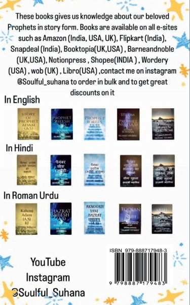 These books gives us knowledge about our beloved Prophets in story form . Books are available on all e-sites such as Amazon (India , USA , UK ) , Flipkart (India ) , Snapdeal (India) , Booktopia (UK,USA) , Barneandnoble(UK,USA) Shopee (India) ,wordery (USA) ,Wob (UK), Libro (USA) , Notionpress . contact me on instagram @Soulful_suhana to order in bulk and to get great discounts on it (A.S)-Alaihi Salam These books are available in English , Hindi , Roman Urdu English : Book 1 : Story of Prophet Adam (A.S) Book 2: Prophet Sheesh (A.S) Book 3: Prophet Idrees (A.S) Book 4 :Strom of Prophet Nuh (A.S) Book 5 : Journey from heaven to strom ( Story of Prophet Adam (A.S) from heaven to Prophet Nuh (A.S) in floods and strom) Roman Urdu Book 1 : "" Kahani Adam (A.S ) Ki"" Book 2:""Hazrat Sheesh (A.S) "" Book 3: "" Aknookh Yani Hazrat Idrees (A.S) "" Book 4 :""Toofan -e-Nuh "" (Story of Hazrat Nuh (A.S)"" Book 5 :""Arsh se Toofan Tak "" (Story of Hazrat Adam (A.S) in Jannah to Hazrat Nuh (A.S) In Floods And Strom ) Hindi ¿¿¿¿¿¿ 1: ¿¿¿¿¿¿ ¿¿¿ (¿¿¿¿¿ ¿¿¿¿) ¿¿ ¿¿¿¿¿ ¿¿¿¿¿¿ 2: ¿¿¿¿¿¿ ¿¿¿ (¿¿¿¿¿ ¿¿¿¿) ¿¿¿¿¿¿ 3: ¿¿¿¿¿¿ ¿¿¿¿¿ (¿¿¿¿¿ ¿¿¿¿) ¿¿¿¿¿¿ 4: ¿¿¿¿¿¿ ¿¿¿ (¿¿¿¿¿ ¿¿¿¿) ¿¿ ¿¿¿¿¿ ¿¿¿¿¿¿ 5: ¿¿¿¿¿ ¿¿ ¿¿¿¿¿ ¿¿ (¿¿¿¿¿¿ ¿¿¿ (¿¿¿¿¿ ¿¿¿¿) ¿¿ ¿¿¿¿¿¿ ¿¿¿ (¿¿¿¿¿ ¿¿¿¿) ¿¿ )