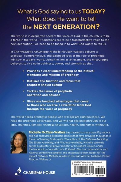 What is God saying to us TODAY? What does He want to tell the NEXT GENERATION? The world is in desperate need of the voice of God. If the church is to be a force in the world. If Christians are to be a transformative voice to the next generation. We need to be tuned in to what God wants to tell us. In The Prophetic Advantage Michelle McClain delivers a practical, comprehensive, and balanced look at the role of the prophetic ministry in today's world. Using the lion as an example, she encourages believers to rise up in boldness, power, and strength, as she... - Provides a clear understanding of the biblical mandates and mission of the prophetic - Outlines the function and focus that prophets should exhibit - Tackles the issues of prophetic operation and balance - Gives one hundred advantages that come to those who receive a revelation from God through the voice of the prophetic. The world needs prophetic people who will declare righteousness. We need the prophetic advantage, and we will not see breakthrough in our jobs, churches, families, financial situations, health, and homes without it.