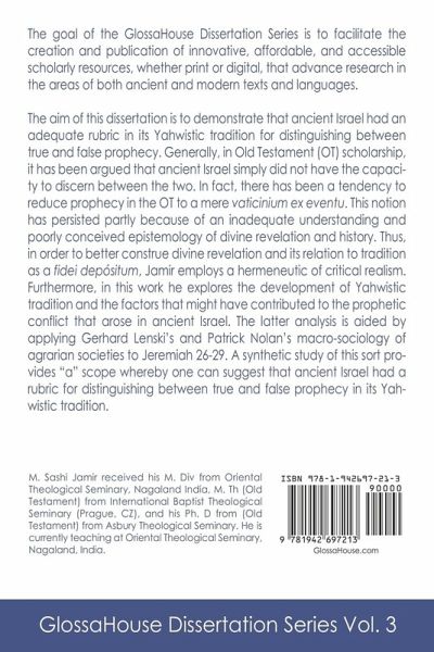 This work argues that ancient Israel had an adequate rubric in its Yahwistic tradition for distinguishing between true and false prophecy. Generally, in Old Testament (OT) scholarship, it has been argued that ancient Israel simply did not have the capacity to discern between the two. In fact, there has been a tendency to reduce prophecy in the OT to a mere vaticinium ex eventu. This notion has persisted partly because of an inadequate understanding and poorly conceived epistemology of divine revelation and history. Thus, in order to better construe divine revelation and its relation to tradition as a fidei depósitum, Jamir employs a hermeneutic of critical realism. Furthermore, in this work he explores the development of Yahwistic tradition and the factors that might have contributed to the prophetic conflict that arose in ancient Israel. The latter analysis is aided by applying Gerhard Lenski's and Patrick Nolan's macro-sociology of agrarian societies to Jeremiah 26-29. A synthetic study of this sort provides "a" scope whereby one can suggest that ancient Israel had a rubric for distinguishing between true and false prophecy in its Yahwistic tradition.
