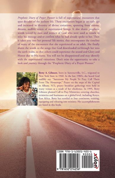 Prophetic Diary of Prayer Pioneer is full of supernatural encounters that span decades of the authors life. These encounters began at an early age and increased in diversity of divine visitations, spanning from visions, dreams, audible voices of supernatural beings. It also shares prophetic words voiced by men and women of God who were used as vessels to relay his message and or confirm what he had already spoke to her. Then it takes you into her personal life stories, that encompasses the timeline of many of the encounters that she experienced as an adult. She finally shares the words to the songs that God downloaded to/through her into the earth realm, so that others could experience the sound and Glory and Honor due to His name. You will not be disappointed and may identify with the supernatural visitations. Don't miss the opportunity to take a look and journey through the "Prophetic Diary of a Prayer Pioneer." Betty A. Gilmore, born in Summerville, S.C., migrated to New York State in 1960. In the late 1980's, she heard God audibly say, "Summons My People To Pray, Call Them From The Housetops." Prayer on the steps of the Capital in Albany, N.Y.; prayer breakfast gatherings were held in many venues as a result of her obedience. In 1995, Betty Gilmore planted Call to Pray Ministries; covering churches, ministries and businesses on a global level, including Kenya, East Africa. Betty has traveled to four continents, training, equipping and releasing into ministry. Her accomplishments are listed in this book.