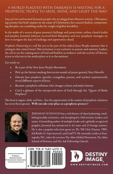 A world plagued with darkness is waiting for a prophetic people to arise, shine, and light the way! Days of crisis and turmoil demand a people who are plugged into Heaven's activity. Old operating systems that built empires in the name of Christianity, but created shallow, compromising disciples, are crumbling under the weight of global instability. In the midst of a season of great personal challenge and persecution, author, church leader and prophet Jeremiah Johnson received fresh blueprints and new prophetic strategies on how to navigate the days of challenge and opportunity ahead. Prophetic Pioneering is a call for you to be part of the radical Jesus People remnant that is arising in this critical hour! This invitation is not exclusive to pastors and ministry leaders; the call to see the coming move of God and build in accordance with the activity of Heaven, is just as relevant in the marketplace as it to the minister. Get ready to: Be a part of the New Jesus People Movement. Pick up the history-making Intercession mantle of prayer general, Rees Howells. Discern how prophets, apostles, evangelists, pastors, and teachers supernaturally reveal different aspects of Jesus. Become a prophetic reformer who changes culture and makes history. Catch a glimpse of the unexpected move of God through the "Queen of Sheba Prophecy." The hour is urgent, dark, and late... but the opportunity to be carriers of prophetic solutions has never been greater. Will you take your place as a prophetic pioneer?