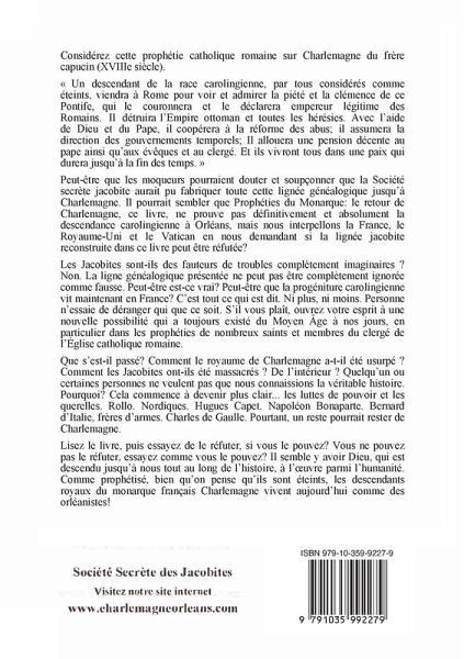 "Un rejeton de la race carolingienne, par tous considérée comme éteinte, viendra à Rome et verra et admirera la piété et la clémence de ce Pontife, qui le couronnera et le déclarera Empereur légitime des Romains. Il détruira l'Empire ottoman et tout hérésies .Avec l'aide de Dieu et du pape, il coopérera à la réforme des abus, il assumera la direction des gouvernements temporels, il assignera une pension décente au pape, aux évêques et au clergé. tous vivent en paix, ce qui durera jusqu'à la fin des temps." Peut-être que les moqueurs pourraient douter et accuser à tort la Société secrète jacobite d'avoir fabriqué toute cette lignée généalogique jusqu'à Charlemagne. Il pourrait sembler que Prophéties du monarque : Le retour de Charlemagne, ce livre, ne prouve pas définitivement et absolument la descendance carolingienne à Orléans, mais nous défions la France, le Royaume-Uni et le Vatican en nous demandant si la lignée jacobite reconstituée dans ce livre peut être réfuté ? Les Jacobites trompent-ils l'humanité ? Non. Les Jacobites présentent ici une lignée généalogique cachée qui ne peut pas être complètement réfutée comme fausse. C'est peut-être vrai ? Peut-être qu'une progéniture carolingienne vit aujourd'hui en France ? C'est tout ce qui est dit. Ni plus ni moins. Personne n'essaie de déranger personne. Veuillez ouvrir votre esprit à une nouvelle possibilité qui a en quelque sorte toujours existé du Moyen Âge à nos jours, en particulier dans les prophéties de nombreux saints et membres du clergé de l'Église catholique romaine. Ce qui s'est passé? Comment le royaume de Charlemagne a-t-il été usurpé ? Comment les Jacobites ont-ils été massacrés ? De l'Intérieur? Quelqu'un ou certaines personnes ne veulent pas que nous connaissions la véritable histoire. Pourquoi? Cela commence à devenir plus clair... luttes de pouvoir et conflits. Rollon. Hugues Capet. Napoléon Bonaparte. Bernard d'Italie, frères d'armes. Normands. Pourtant, un reste pourrait rester de Charlemagne. Lisez le livre, puis essayez de le réfuter, si vous le pouvez ? Nous affirmons qu'elle ne peut pas être facilement réfutée et qu'elle ne doit donc pas être rejetée. Il semble y avoir une puissance supérieure à l'¿uvre parmi l'humanité qui nous est parvenue tout au long de l'histoire. Comme prophétisé, bien que l'on pense qu'ils sont éteints, les descendants royaux du monarque français Charlemagne vivent aujourd'hui en tant qu'orléanistes ! Veuillez visiter : www.CharlemagneOrleans.com