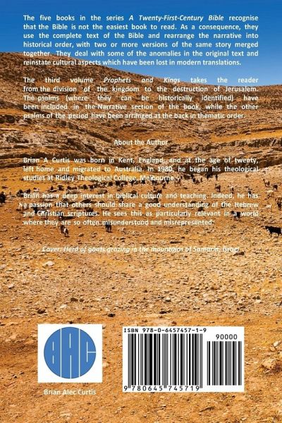 The five books in the series A Twenty-First-Century Bible recognise that the Bible is not the easiest book to read. As a consequence, they use the complete text of the Bible and rearrange the narrative into historical order, with two or more versions of the same story merged together. They deal with some of the anomalies in the original text and reinstate cultural aspects which have been lost in modern translations. The text is presented in two types: a translation of the original languages in normal print; and additions-to help the flow of the narrative and to enlighten the reader to some of the cultural background and meaning-in italics. The third volume Prophets and Kings takes the reader from the division of the kingdom to the destruction of Jerusalem. The psalms (where they can be historically identified) have been included in the Narrative section of the book, while the other psalms of the period have been arranged at the back in thematic order.