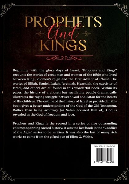 Beginning with the glory days of Israel, "Prophets and Kings" recounts the stories of great men and women of the Bible who lived between King Solomon's reign and the First Advent of Christ. The stories of Elijah, Daniel, Isaiah, Jeremiah, Hezekiah, the captivity of Israel, and others are all found in this wonderful book. Within its pages, the history of a chosen but vacillating people dramatically illustrates the raging struggle between God and Satan for the hearts of His children. The outline of the history of Israel as provided in this book gives a better understanding of the God of the Old Testament. Rather than being arbitrary (as Satan has accused Him of), God is revealed as the God of freedom and love. Prophets and Kings is the second in a series of five outstanding volumbes spanning sacred history. It was the last book in the "Conflict of the Ages" series to be written. It was also that last of many rich works to come from the gifted pen of Ellen G. White.