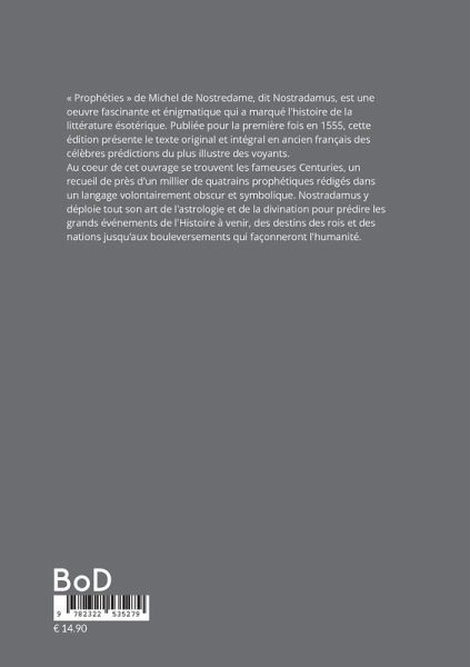 « Prophéties » de Michel de Nostredame, dit Nostradamus, est une oeuvre fascinante et énigmatique qui a marqué l'histoire de la littérature ésotérique. Publiée pour la première fois en 1555, cette édition présente le texte original et intégral en ancien français des célèbres prédictions du plus illustre des voyants. Au coeur de cet ouvrage se trouvent les fameuses Centuries, un recueil de près d'un millier de quatrains prophétiques rédigés dans un langage volontairement obscur et symbolique. Nostradamus y déploie tout son art de l'astrologie et de la divination pour prédire les grands événements de l'Histoire à venir, des destins des rois et des nations jusqu'aux bouleversements qui façonneront l'humanité. Le lecteur plongera dans un univers où guerres, révolutions, catastrophes naturelles et avènements de personnages puissants se côtoient dans une vision cosmique du temps. Au-delà des prédictions elles-mêmes, les « Prophéties » révèlent une véritable philosophie ésotérique, où le destin des hommes se lit dans les astres et les grandes conjonctions planétaires. Héritier des traditions médiévales d'astrologie et d'arts divinatoires, Nostradamus offre bien plus qu'un simple exercice de voyance. Son oeuvre est empreinte d'un profond humanisme, cherchant à éclairer ses contemporains sur les dangers qui les guettent et à les inciter à infléchir le cours des événements par leur libre arbitre et leur sagesse. Cette édition s'inscrit dans les catégories « Ésotérisme », « Histoire » et « Littérature française » sur Amazon. Elle offre aux chercheurs, aux passionnés d'histoire et aux amateurs de mystères une plongée authentique dans l'univers fascinant de Nostradamus, préservant toute la puissance évocatrice et la richesse linguistique du texte original. Découvrez les visions prophétiques qui ont traversé les siècles et continuent d'interroger notre rapport à l'avenir et au sens caché de l'Histoire.