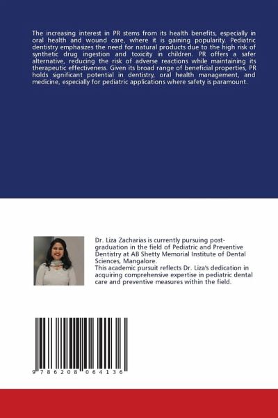 The increasing interest in PR stems from its health benefits, especially in oral health and wound care, where it is gaining popularity. Pediatric dentistry emphasizes the need for natural products due to the high risk of synthetic drug ingestion and toxicity in children. PR offers a safer alternative, reducing the risk of adverse reactions while maintaining its therapeutic effectiveness. Given its broad range of beneficial properties, PR holds significant potential in dentistry, oral health management, and medicine, especially for pediatric applications where safety is paramount.
