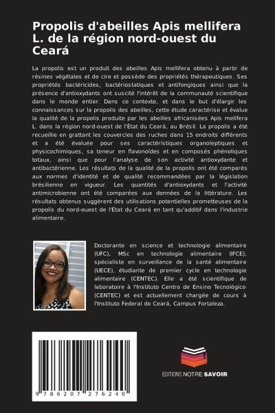 La propolis est un produit des abeilles Apis mellifera obtenu à partir de résines végétales et de cire et possède des propriétés thérapeutiques. Ses propriétés bactéricides, bactériostatiques et antifongiques ainsi que la présence d'antioxydants ont suscité l'intérêt de la communauté scientifique dans le monde entier. Dans ce contexte, et dans le but d'élargir les connaissances sur la propolis des abeilles, cette étude caractérise et évalue la qualité de la propolis produite par les abeilles africanisées Apis melífera L. dans la région nord-ouest de l'État du Ceará, au Brésil. La propolis a été recueillie en grattant les couvercles des ruches dans 15 endroits différents et a été évaluée pour ses caractéristiques organoleptiques et physicochimiques, sa teneur en flavonoïdes et en composés phénoliques totaux, ainsi que pour l'analyse de son activité antioxydante et antibactérienne. Les résultats de la qualité de la propolis ont été comparés aux normes d'identité et de qualité recommandées par la législation brésilienne en vigueur. Les quantités d'antioxydants et l'activité antimicrobienne ont été comparées aux données de la littérature. Les résultats obtenus suggèrent des utilisations potentielles prometteuses de la propolis du nord-ouest de l'État du Ceará en tant qu'additif dans l'industrie alimentaire.