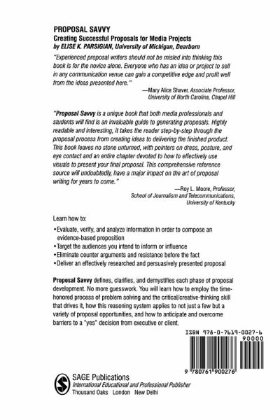 Media professionals and novices in every division of mass communication are expected to produce effectively researched, written and presented proposals for enterprise projects. Drawing on the experience of over 90 media professionals, this essential book describes the creative process necessary to produce such proposals for print and broadcast media, public relations and advertising projects. Elise Parsigian describes types of project proposal and the problems which may be encountered in their creation; explains how to critically evaluate and manage information to arrive at an evidence-based solution; and examines what to include in a proposal and how to express it - both orally and visually. Sections on 'How the Pros Do It' are included throughout the book to illustrate real world problem-solving procedures and thought processes.