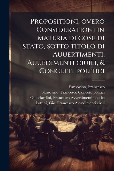 Propositioni, overo Considerationi in materia di cose di stato, sotto titolo di Auuertimenti, Auuedimenti ciuili, & Concetti politici is a collection of political writings compiled by Francesco Sansovino in 1582. This volume assembles insightful considerations on matters of state, presenting a range of perspectives under the headings of 'Auuertimenti', 'Auuedimenti ciuili', and 'Concetti politici'. The work includes selections from Francesco Guicciardini's 'Avvertimenti politici' and Gio. Francesco Lottini's 'Avvedimenti civili', offering readers a comprehensive overview of political thought during the Renaissance. Sansovino's compilation serves as a valuable resource for understanding the complex dynamics of state governance and the prevailing political philosophies of the time. This work has been selected by scholars as being culturally important, and is part of the knowledge base of civilization as we know it. This work was reproduced from the original artifact, and remains as true to the original work as possible. Therefore, you will see the original copyright references, library stamps (as most of these works have been housed in our most important libraries around the world), and other notations in the work. This work is in the public domain in the United States of America, and possibly other nations. Within the United States, you may freely copy and distribute this work, as no entity (individual or corporate) has a copyright on the body of the work. As a reproduction of a historical artifact, this work may contain missing or blurred pages, poor pictures, errant marks, etc. Scholars believe, and we concur, that this work is important enough to be preserved, reproduced, and made generally available to the public. We appreciate your support of the preservation process, and thank you for being an important part of keeping this knowledge alive and relevant.