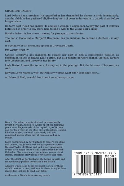 Two tales of intrigue among English aristocrats. In Graymere Gambit, intrigue abounds and a triangle forms when a duke demands that his rakish heir choose a bride from among the bevy of young ladies invited to the castle. In Falworth Folly, the sordid past of the companion of a noble lady catches up to threaten her future with a wealthy man.