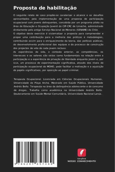 O seguinte relato de caso propõe-se caraterizar o alcance e os desafios apresentados pela implementação de uma proposta de participação ocupacional com jovens delinquentes, concebida por um programa piloto na Área de Educação e Ocupação Juvenil do CIP-CRC de Limache, administrado diretamente pelo antigo Serviço Nacional de Menores (SENAME) do Chile.O objetivo deste exercício é sistematizar a proposta para compreender e propor uma contribuição para a melhoria das práticas e metodologias, contribuindo assim para o enriquecimento da teoria, das políticas públicas, do desenvolvimento profissional das equipas e do processo de construção dos projectos de vida de cada jovem recluso.As experiências de vida, o contexto anterior, as competências, os interesses e os valores são vistos como fundamentais na relação entre a participação e a experiência de privação de liberdade enquanto jovem e, por isso, um processo de experimentação significativa, através dos níveis de participação ocupacional do MOHO, pode facilitar a motivação e a aquisição de papéis significativos, por oposição ao papel criminal.