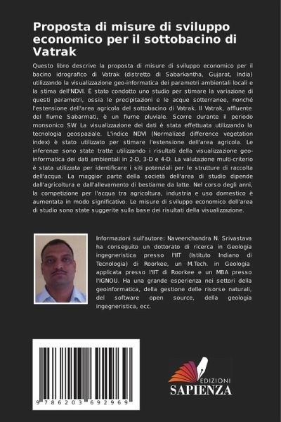 Questo libro descrive la proposta di misure di sviluppo economico per il bacino idrografico di Vatrak (distretto di Sabarkantha, Gujarat, India) utilizzando la visualizzazione geo-informatica dei parametri ambientali locali e la stima dell'NDVI. È stato condotto uno studio per stimare la variazione di questi parametri, ossia le precipitazioni e le acque sotterranee, nonché l'estensione dell'area agricola del sottobacino di Vatrak. Il Vatrak, affluente del fiume Sabarmati, è un fiume pluviale. Scorre durante il periodo monsonico SW. La visualizzazione dei dati è stata effettuata utilizzando la tecnologia geospaziale. L'indice NDVI (Normalized difference vegetation index) è stato utilizzato per stimare l'estensione dell'area agricola. Le inferenze sono state tratte utilizzando i risultati della visualizzazione geo-informatica dei dati ambientali in 2-D, 3-D e 4-D. La valutazione multi-criterio è stata utilizzata per identificare i siti potenziali per le strutture di raccolta dell'acqua. La maggior parte della società dell'area di studio dipende dall'agricoltura e dall'allevamento di bestiame da latte. Nel corso degli anni, la competizione per l'acqua tra agricoltura, industria e uso domestico è aumentata in modo significativo. Le misure di sviluppo economico dell'area di studio sono state suggerite sulla base dei risultati della visualizzazione.