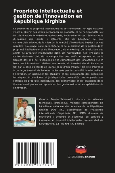 La gestion de la propriété intellectuelle et de l'innovation - un type d'activité visant à obtenir des droits personnels de propriété et de non-propriété sur les résultats de la créativité intellectuelle, l'utilisation de ces résultats et la disposition des droits y afférents afin de bénéficier de leur commercialisation et de la mise sur le marché d'innovations basées sur ces résultats. L'ouvrage traite de la théorie et de la pratique de la gestion de la propriété intellectuelle et de l'innovation, du marketing, de l'évaluation des objets de propriété intellectuelle (OPI), de l'introduction des OPI dans le chiffre d'affaires civil, de la comptabilité des actifs incorporels et de la fiscalité des OPI, de l'évaluation de la compétitivité des innovations sur la base des informations relatives aux brevets, du transfert des droits sur les OPI sur la base d'accords de licence et de droits d'auteur. Ce livre s'adresse à un large éventail de lecteurs intéressés par la propriété intellectuelle et l'innovation, en particulier les étudiants et les enseignants des spécialités techniques, économiques et juridiques des universités, les employés des services de propriété intellectuelle, les économistes et les praticiens de la finance, ainsi que les entrepreneurs, les gestionnaires et les spécialistes de l'innovation.