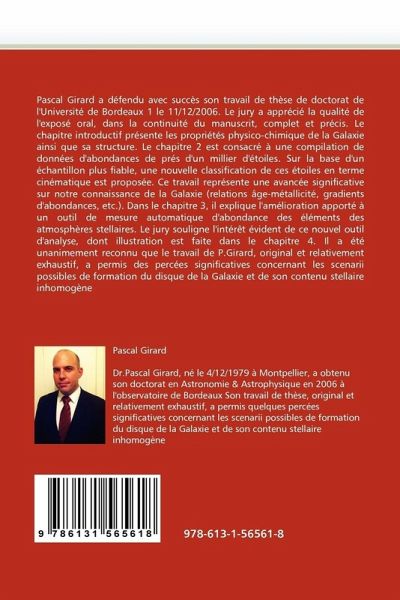Pascal Girard a défendu avec succès son travail de thèse de doctorat de l'Université de Bordeaux 1 le 11/12/2006. Le jury a apprécié la qualité de l'exposé oral, dans la continuité du manuscrit, complet et précis. Le chapitre introductif présente les propriétés physico-chimique de la Galaxie ainsi que sa structure. Le chapitre 2 est consacré à une compilation de données d'abondances de prés d'un millier d'étoiles. Sur la base d'un échantillon plus fiable, une nouvelle classification de ces étoiles en terme cinématique est proposée. Ce travail représente une avancée significative sur notre connaissance de la Galaxie (relations âge-métallicité, gradients d'abondances, etc.). Dans le chapitre 3, il explique l'amélioration apporté à un outil de mesure automatique d'abondance des éléments des atmosphères stellaires. Le jury souligne l'intérêt évident de ce nouvel outil d'analyse, dont illustration est faite dans le chapitre 4. Il a été unanimement reconnu que le travail de P.Girard, original et relativement exhaustif, a permis des percées significatives concernant les scenarii possibles de formation du disque de la Galaxie et de son contenu stellaire inhomogène