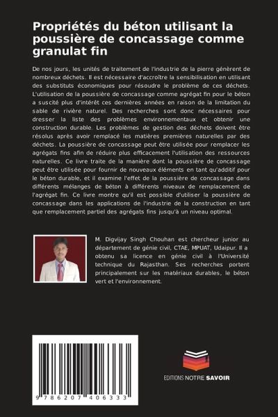 De nos jours, les unités de traitement de l'industrie de la pierre génèrent de nombreux déchets. Il est nécessaire d'accroître la sensibilisation en utilisant des substituts économiques pour résoudre le problème de ces déchets. L'utilisation de la poussière de concassage comme agrégat fin pour le béton a suscité plus d'intérêt ces dernières années en raison de la limitation du sable de rivière naturel. Des recherches sont donc nécessaires pour dresser la liste des problèmes environnementaux et obtenir une construction durable. Les problèmes de gestion des déchets doivent être résolus après avoir remplacé les matières premières naturelles par des déchets. La poussière de concassage peut être utilisée pour remplacer les agrégats fins afin de réduire plus efficacement l'utilisation des ressources naturelles. Ce livre traite de la manière dont la poussière de concassage peut être utilisée pour fournir de nouveaux éléments en tant qu'additif pour le béton durable, et il examine l'effet de la poussière de concassage dans différents mélanges de béton à différents niveaux de remplacement de l'agrégat fin. Ce livre montre qu'il est possible d'utiliser la poussière de concassage dans les applications de l'industrie de la construction en tant que remplacement partiel des agrégats fins jusqu'à un niveau optimal.