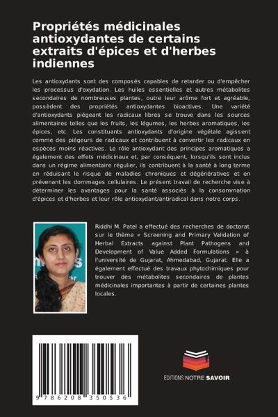 Les antioxydants sont des composés capables de retarder ou d'empêcher les processus d'oxydation. Les huiles essentielles et autres métabolites secondaires de nombreuses plantes, outre leur arôme fort et agréable, possèdent des propriétés antioxydantes bioactives. Une variété d'antioxydants piégeant les radicaux libres se trouve dans les sources alimentaires telles que les fruits, les légumes, les herbes aromatiques, les épices, etc. Les constituants antioxydants d'origine végétale agissent comme des piégeurs de radicaux et contribuent à convertir les radicaux en espèces moins réactives. Le rôle antioxydant des principes aromatiques a également des effets médicinaux et, par conséquent, lorsqu'ils sont inclus dans un régime alimentaire régulier, ils contribuent à la santé à long terme en réduisant le risque de maladies chroniques et dégénératives et en prévenant les dommages cellulaires. Le présent travail de recherche vise à déterminer les avantages pour la santé associés à la consommation d'épices et d'herbes et leur rôle antioxydant/antiradical dans notre corps.