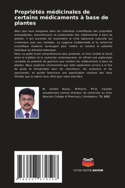 Alors que nous naviguons dans les méandres scientifiques des propriétés antioxydantes, antiulcéreuses et cicatrisantes des médicaments à base de plantes, il est essentiel de reconnaître la riche tapisserie culturelle qui s'entrelace avec ces remèdes. La sagesse traditionnelle et la recherche scientifique moderne convergent pour mettre en lumière le potentiel holistique du domaine botanique.Dans sa quête d'une compréhension plus profonde, ce livre comble le fossé entre la tradition et la recherche contemporaine, en offrant une exploration complète du potentiel de guérison que recèlent les médicaments à base de plantes. Nous espérons sincèrement que cette exploration servira à la fois de guide et d'inspiration pour les chercheurs, les praticiens et les passionnés, et qu'elle favorisera une appréciation continue des dons illimités que la nature nous offre pour notre bien-être.