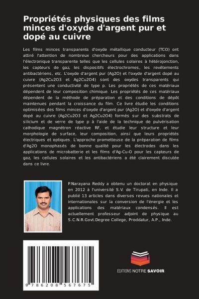 Les films minces transparents d'oxyde métallique conducteur (TCO) ont attiré l'attention de nombreux chercheurs pour des applications dans l'électronique transparente telles que les cellules solaires à hétérojonction, les capteurs de gaz, les dispositifs électrochromes, les revêtements antibactériens, etc. L'oxyde d'argent pur (Ag2O) et l'oxyde d'argent dopé au cuivre (Ag2Cu2O3 et Ag2Cu2O4) sont des oxydes transparents qui présentent une conductivité de type p. Les propriétés de ces matériaux dépendent de leur composition chimique. Les propriétés de ces matériaux dépendent de la méthode de préparation et des conditions de dépôt maintenues pendant la croissance du film. Ce livre étudie les conditions optimisées des films minces d'oxyde d'argent pur (Ag2O) et d'oxyde d'argent dopé au cuivre (Ag2Cu2O3 et Ag2Cu2O4) formés sur des substrats de silicium et de verre de type p à l'aide de la technique de pulvérisation cathodique magnétron réactive RF, et étudie leur structure et leur morphologie de surface, leur composition, ainsi que leurs propriétés électriques et optiques. L'approche prometteuse de la préparation de films d'Ag2O monophasés de bonne qualité pour les électrodes dans les applications de microbatterie et les films d'Ag-Cu-O pour les capteurs de gaz, les cellules solaires et les antibactériens a été clairement discutée dans ce livre.