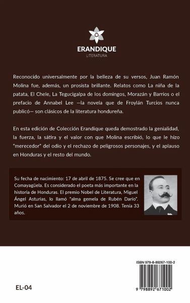 Reconocido universalmente por la belleza de sus versos, Juan Ramón Molina fue, además, un prosista brillante. Relatos como La niña de la patata, El Chele, La Tegucigalpa de los domingos, Morazán y Barrios o el prefacio de Annabel Lee -la novela que de Froylán Turcios nunca publicó- son clásicos de la literatura hondureña. En esta edición de Colección Erandique quedan demostrados el valor, el fino acabado, la genialidad, la fuerza y la sátira con que Molina escribió, lo que le hizo "merecedor" del odio y el rechazo de peligrosos personajes, y el aplauso en Honduras y el resto del mundo. Su fecha de nacimiento: 17 de abril de 1875. Se cree que en Comayagüela. Es considerado el poeta más importante en la historia de Honduras. El premio Nobel de Literatura, Miguel Ángel Asturias, lo llamó "alma gemela de Rubén Darío". Murió en San Salvador el 2 de noviembre de 1908. Tenía 33 años.