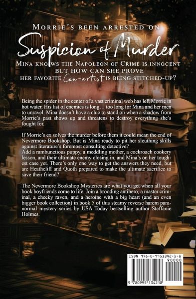 Morrie's been arrested on suspicion of murder. Mina knows the Napoleon of Crime is innocent, but how can she prove her favorite con-artist is being stitched-up? Being the spider in the center of a vast criminal web has left Morrie in hot water. His list of enemies is long... too long for Mina and her men to unravel. Mina doesn't have a clue to stand on when a shadow from Morrie's past shows up and threatens to destroy everything she's fought for. If Morrie's ex solves the murder before them it could mean the end of Nevermore Bookshop. But is Mina ready to pit her sleuthing skills against literature's foremost consulting detective? Add a rambunctious puppy, a meddling mother, a cockroach cookery lesson, and their ultimate enemy closing in, and Mina's on her toughest case yet. There's only one way to get the answers they need, but are Heathcliff and Quoth prepared to make the ultimate sacrifice to save their friend? The Nevermore Bookshop Mysteries are what you get when all your book boyfriends come to life. Join a brooding antihero, a master criminal, a cheeky raven, and a heroine with a big heart (and an even bigger book collection) in book 5 of this steamy reverse harem paranormal mystery series by USA Today bestselling author Steffanie Holmes.