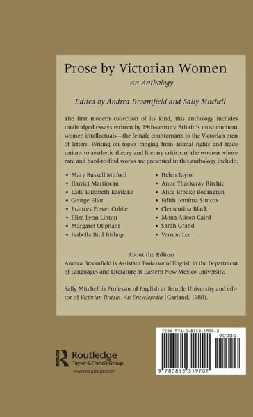 First published in 1996. The first modern collection of its kind, this anthology includes unabridged essays written by 19th century Britain's' most eminent women intellectuals- the female counter-parts to the Victorian men of letters. Writing on topics ranging from animal rights and trade unions to aesthetic theory and literary criticism, the women whose rare and hard-to-find woks are presented in this anthology include Mary Russell Mitford, George Eliot, Lady Elizabeth Eastlake, Isabella Bird Bishop, Anne Thackerary Ritchie, Sarah Grand and others.