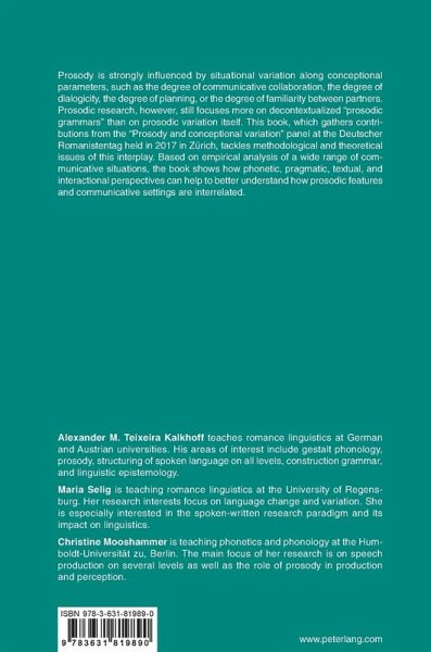Prosody is strongly influenced by situational variation along conceptional parameters, such as the degree of communicative collaboration, the degree of dialogicity, the degree of planning, or the degree of familiarity between partners. Prosodic research, however, still focuses more on decontextualized "prosodic grammars" than on prosodic variation itself. This book, which gathers contributions from the "Prosody and conceptional variation" panel at the Deutscher Romanistentag held in 2017 in Zürich, tackles methodological and theoretical issues of this interplay. Based on empirical analysis of a wide range of communicative situations, the book shows how phonetic, pragmatic, textual, and interactional perspectives can help to better understand how prosodic features and communicative settings are interrelated.
