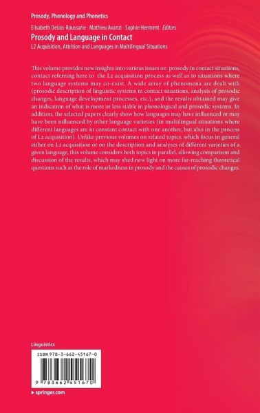 This volume provides new insights into various issues on prosody in contact situations, contact referring here to the L2 acquisition process as well as to situations where two language systems may co-exist. A wide array of phenomena are dealt with (prosodic description of linguistic systems in contact situations, analysis of prosodic changes, language development processes, etc.), and the results obtained may give an indication of what is more or less stable in phonological and prosodic systems. In addition, the selected papers clearly show how languages may have influenced or may have been influenced by other language varieties (in multilingual situations where different languages are in constant contact with one another, but also in the process of L2 acquisition). Unlike previous volumes on related topics, which focus in general either on L2 acquisition or on the description and analyses of different varieties of a given language, this volume considers both topics in parallel, allowing comparison and discussion of the results, which may shed new light on more far-reaching theoretical questions such as the role of markedness in prosody and the causes of prosodic changes.