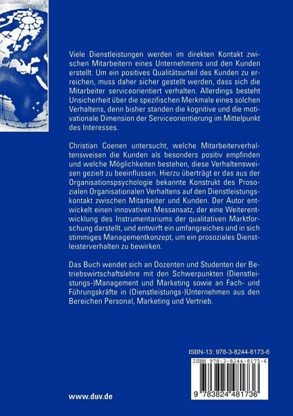 Christian Coenen untersucht, welche Mitarbeiterverhaltensweisen die Kunden als besonders positiv empfinden und welche Möglichkeiten bestehen, diese Verhaltensweisen gezielt zu beeinflussen. Hierzu überträgt er das aus der Organisationspsychologie bekannte Konstrukt des Prosozialen Organisationalen Verhaltens auf den Dienstleistungskontakt zwischen Mitarbeiter und Kunden. Der Autor entwickelt einen innovativen Messansatz, der eine Weiterentwicklung des Instrumentariums der qualitativen Marktforschung darstellt, und entwirft ein umfangreiches und in sich stimmiges Managementkonzept, um ein prosoziales Dienstleisterverhalten zu bewirken.