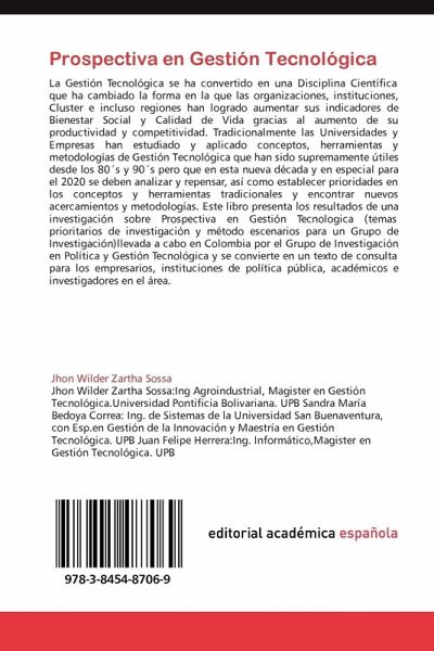 La Gestión Tecnológica se ha convertido en una Disciplina Científica que ha cambiado la forma en la que las organizaciones, instituciones, Cluster e incluso regiones han logrado aumentar sus indicadores de Bienestar Social y Calidad de Vida gracias al aumento de su productividad y competitividad. Tradicionalmente las Universidades y Empresas han estudiado y aplicado conceptos, herramientas y metodologías de Gestión Tecnológica que han sido supremamente útiles desde los 80 s y 90 s pero que en esta nueva década y en especial para el 2020 se deben analizar y repensar, así como establecer prioridades en los conceptos y herramientas tradicionales y encontrar nuevos acercamientos y metodologías. Este libro presenta los resultados de una investigación sobre Prospectiva en Gestión Tecnologica (temas prioritarios de investigación y método escenarios para un Grupo de Investigación)llevada a cabo en Colombia por el Grupo de Investigación en Política y Gestión Tecnológica y se convierte en un texto de consulta para los empresarios, instituciones de política pública, académicos e investigadores en el área.