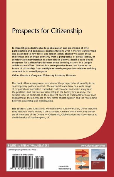 This book is available as open access through the Bloomsbury Open Access programme and is available on www.bloomsburycollections.com. Is citizenship in decline due to globalisation and an erosion of civic participation and democratic representation? Or is it merely transformed and extended to new levels and larger scales? Should we assess these challenges and changes primarily from a perspective of global justice, or consider also membership in a democratic polity as itself a basic good? Prospects for Citizenship addresses these broad questions in a unique collaborative effort. The result is an impressive book that looks at the future of citizenship from multiple research perspectives while remaining coherent in its overall purpose. Rainer Bauböck, European University Institute, Florence This book offers a perspicuous overview of the prospects for citizenship in our contemporary political context. The authorial team draw on a wide range of empirical and normative research in order to offer an incisive analysis of the problems and pressures of citizenship in the twenty-first century. The authors focus in particular on the apparent decline of traditional forms of civic engagement, the emergence of new forms of participation and the relationship between citizenship and globalization.