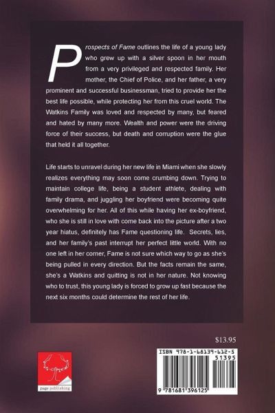 Prospects of Fame outlines the life of a young lady who grew up with a silver spoon in her mouth from a very privileged and respected family. Her mother, the Chief of Police, and her father, a very prominent and successful businessman, tried to provide her the best life possible, while protecting her from this cruel world. The Watkins Family was loved and respected by many, but feared and hated by many more. Wealth and power were the driving force of their success, but death and corruption were the glue that held it all together. Life starts to unravel during her new life in Miami when she slowly realizes everything may soon come crumbing down. Trying to maintain college life, being a student athlete, dealing with family drama, and juggling her boyfriend were becoming quite overwhelming for her. All of this while having her ex-boyfriend, who she is still in love with come back into the picture after a two year hiatus, definitely has Fame questioning life. Secrets, lies, and her family's past interrupt her perfect little world. With no one left in her corner, Fame is not sure which way to go as she's being pulled in every direction. But the facts remain the same, she's a Watkins and quitting is not in her nature. Not knowing who to trust, this young lady is forced to grow up fast because the next six months could determine the rest of her life.